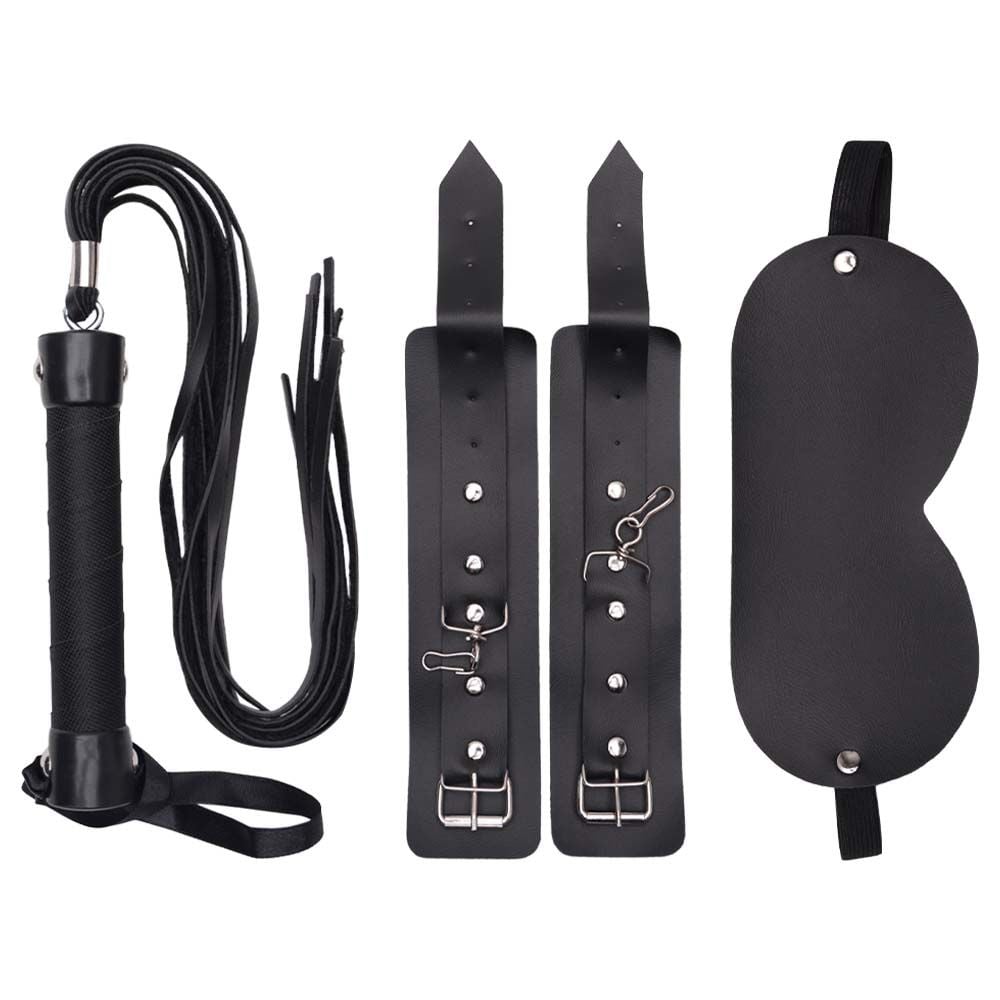 Kit contém um par de Algemas Bracelete, uma Venda e um Chicote de Tiras. Acessório confeccionado em sintético semelhante à couro com revestimento interno aveludado. Ajustável e regulável de acordo com suas medidas para garantir conforto, fácil acomodação e uso correto do acessório. Detalhes de fivelas, fecho e travas em metal niquelado que garantem qualidade e durabilidade.